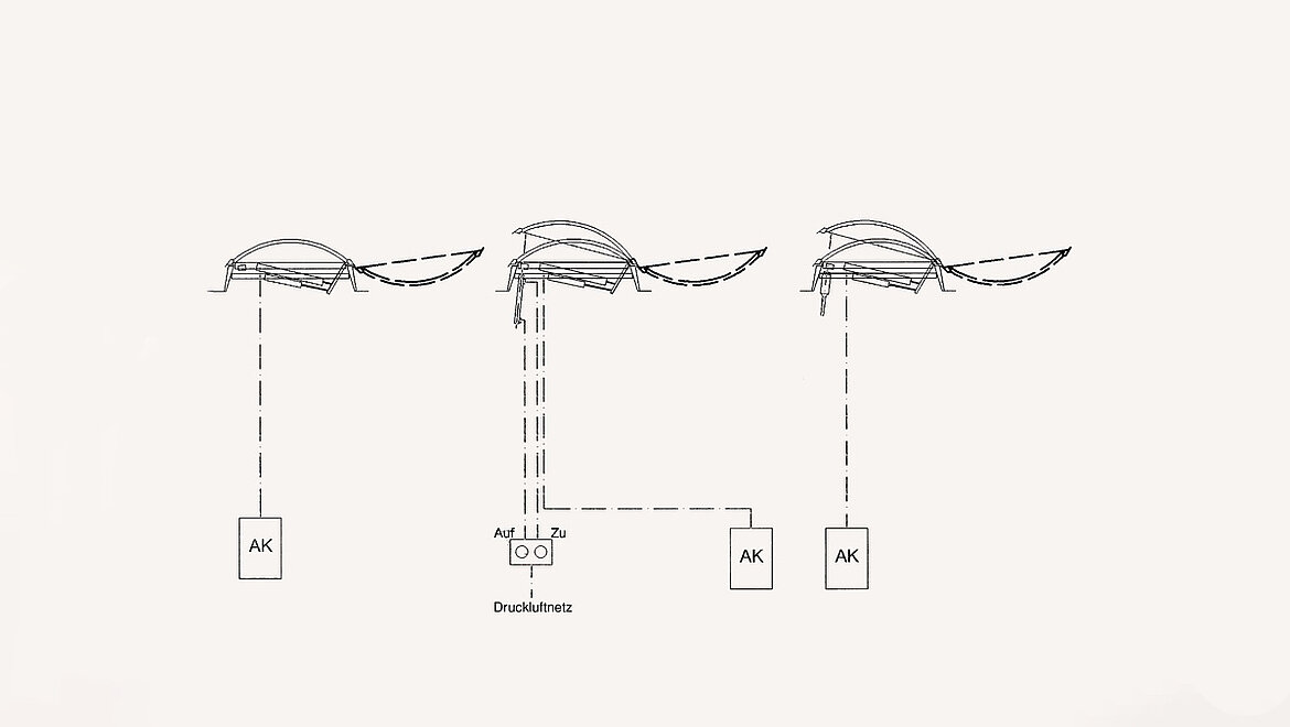 - RWA-fonksiyonu alternatif olarak yalnızca açık veya açık / kapalı: İsteğe bağlı kapalı fonksiyonu, işlevsel bir testten sonra kolay ve pnömatik kapatma veya alarm kutusu üzerinden istemsiz tetikleme içindir. Avantaj: Tonoz’un artık daha büyük bir çaba sarf ederek, çatıdan kapatılması gerekmez. Böylece, CI sistemi duman tahliye kapağının RWA fonksiyonları, kısa aralıklar dahi alarm kutusu aracılığıyla rahatlıkla test edilebilir.